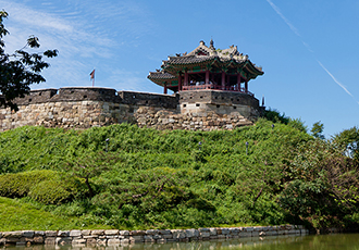 The Northern Watergate, also known as Hwahongmun, was built atop Suwoncheon Stream, the main stream flowing through Hwaseong Fortress. It has seven stone arches, with the middle arch being wider than the others to emphasize the center of the entire structure. On each end of the bridge is an octagonal stone pillar topped with a statue of a mythical, dragon-like creature called imugi in Korean. Atop the arches, a stone bridge was built so that people could cross the stream, and a wooden pavilion was added on the top of the bridge.